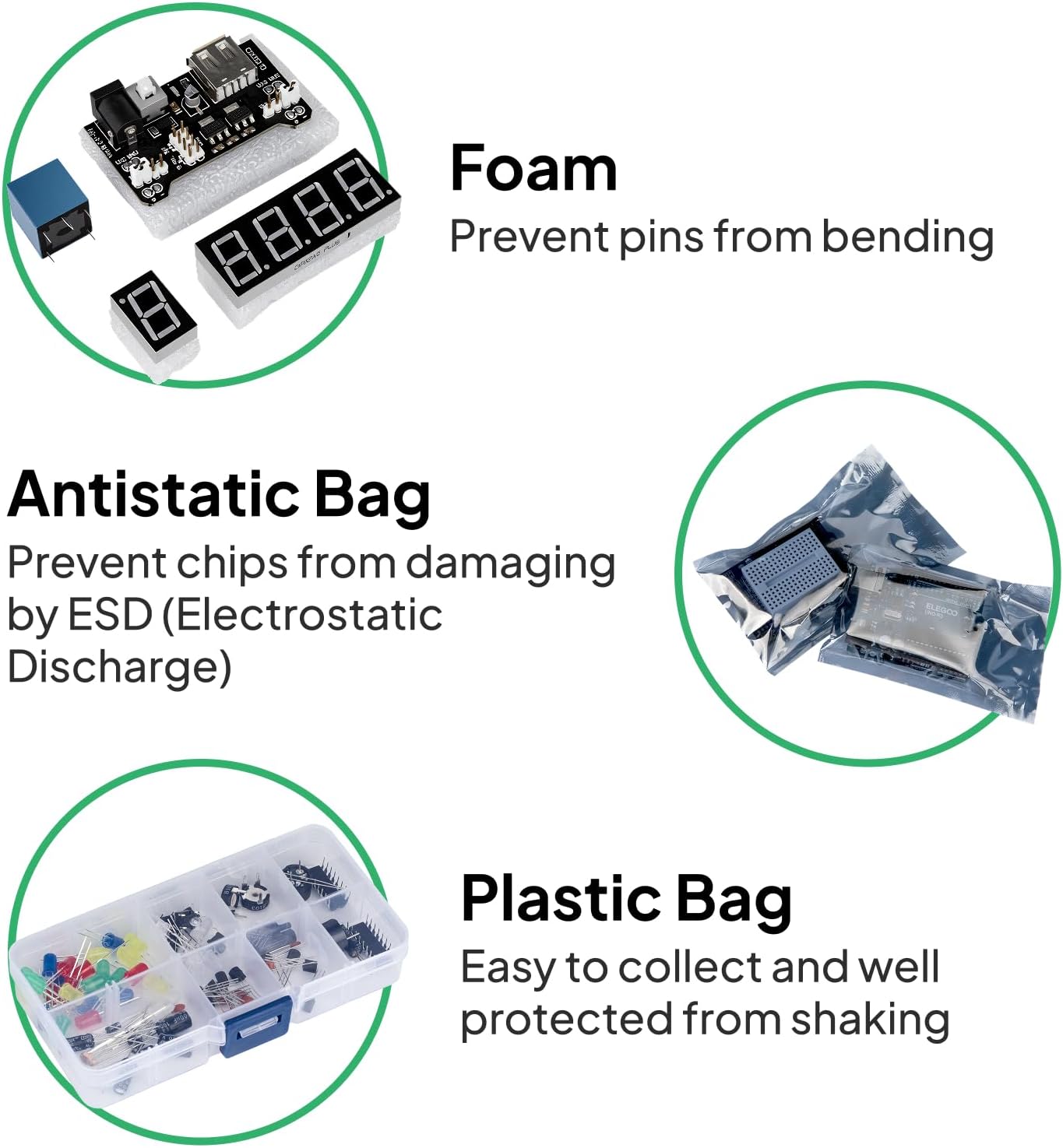 הערכת מגיעה באריזת קייס מחולק עם קופסה נוספת לחלקים קטנים כמו נוריות LED, מעגלים משולבים (IC), כפתורים, דיודות ועוד.